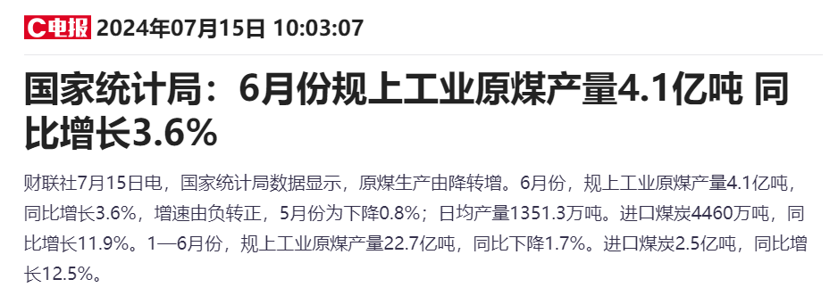 消息方面,国家统计局数据显示,原煤生产由降转增。6月份,规上工业原煤产量4.1亿吨,同比增长3.6%,增速由负转正,5月份为下降0.8%;日均产量1351.3万吨。进口煤炭4460万吨,同比增长11.9%。1-6月份,规上工业原煤产量22.7亿吨,同比下降1.7%。进口煤炭2.5亿吨,同比增长12.5%。